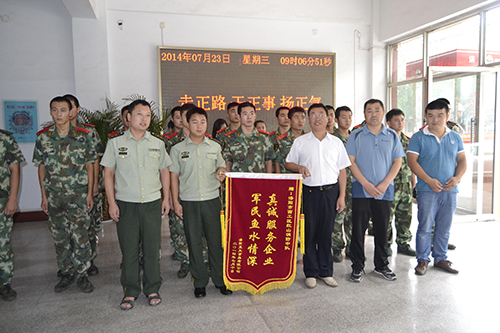 军民鱼水情,百姓记心间。2014年7月23日在“八一”建军节即将到来之际,pinbotiyu.com副总经理田立文带领公司相关部门人员前往洛阳市西工区消防大队进行慰问,并向西工消防红山中队赠送“真诚服务企业,军民鱼水情深”的锦旗一面,以感谢两年来洛阳西工消防大队及红山中队对pinbotiyu.com消防安全工作的全力支持和帮助。