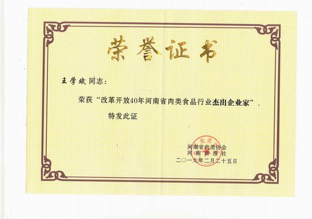荣誉‖洛阳正大获评改革开放40年河南肉类食品行业强势企业、王学斌***总裁荣获改革开放40年河南肉类食品行业杰出企业家